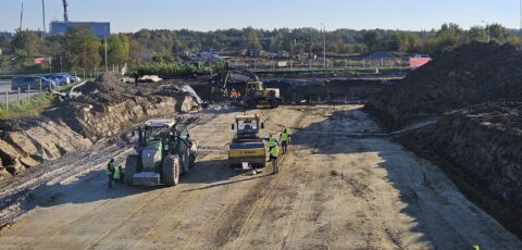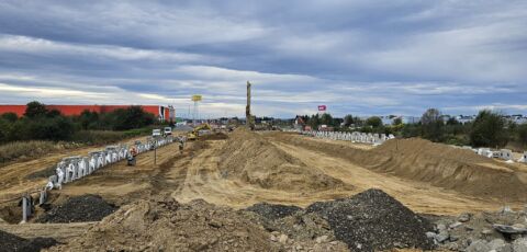 Korzystając ze sprzyjającej pogody prowadzimy też intensywne prace związane ze stabilizacją dolnych warstw nasypu drogowego oraz budową murów oporowych z gruntu zbrojonego.